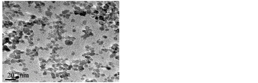 Obtaining the smallest particle size possible is essential for a successful synthesis of nanoparticles. Once prepared for visualization through the electronic transmission microscope, the samples were analyzed to determine average size. The Fe3O4 magnetite nanoparticles obtained showed irregular shape with an average size of 15 nm, calculated by means of TEM. Figure 1 shows a TEM micrograph of bare particles.