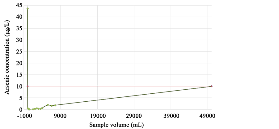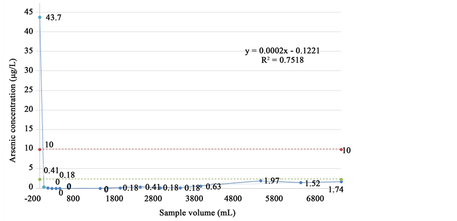 It was found that the filters could treat an important amount of water with arsenic. In view of their high performance, it was decided to estimate the projected quantity of water that could be treated with the same filters. The yield volume of the composite material of the prototype was calculated, continuing the trend line. A straight line equation was used for calculation. Figure 4 shows the trend from 9 L of arsenic solution prepared in the laboratory and passed through the filters. The productivity of the filters was estimated in 50 L.