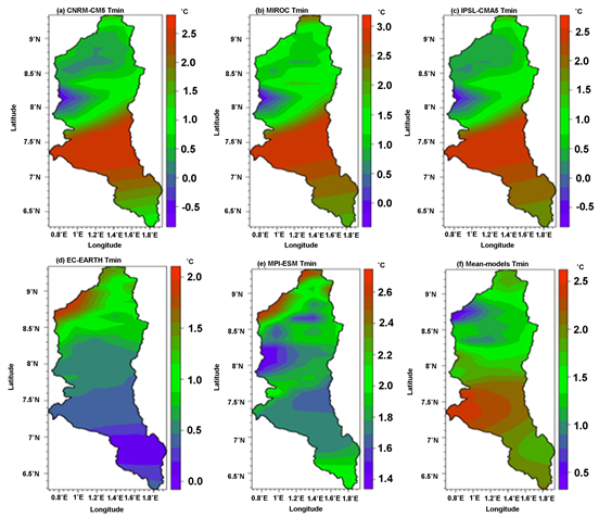 The analysis of projected minimum temperature for far future revealed that there is a relative uniform evolution over the entire study period for all models except models CNRM-CM5 (Figure 4(a)) and IPSL-CMA5 (Figure 4(c)). Indeed, in the northward, the minimum temperature were projected and will increase for (mean value 1.5˚C), (mean value 1.5˚C), (mean value 2˚C) and (mean value 1.5˚C), respectively, for models MIROC5 (Figure 4(b)), EC-EARTH (Figure 4(d)), MPI-ESM-LR (Figure 4(e)) and Mean-Models (Figure 4(f)). For the models CNRM-CM5 (Figure 4(a)) and IPSL-CMA5 (Figure 4(c)), the results exhibit a decreasing average for the minimum temperature on some area (mean value −0.5˚C) and an increase on the rest in the north (Figure 4). When considering the southward and the center, models used predict an increasing average for, (mean value 2.5˚C), (mean value 0.5˚C), (mean value 1.8˚C), (mean value 2˚C), (mean value 1.2˚C), (mean value 1.5˚C) and (mean value 1.8˚C)), respectively, for models MIROC5 (Figure 4(b)), EC-EARTH (Figure 4(d)), MPI-ESM-LR (Figure 4(e)) and Mean-Models (Figure 4(f)). While for models CNRM-CM5 (Figure 4(a)) and (C) IPSL-CMA5 (Figure 4(c)), the results show a relative rise of the minimum temperature but more than 1˚C.