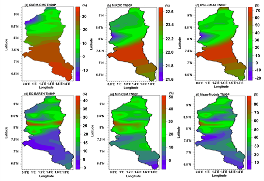 Table 4. Summary of mean projected changes (%) in the 10th percentile of daily minimum (TN10P) and maximum temperature (TX10P) between far future and historical period under Scenario RCP8.5 over Mono River Basin.