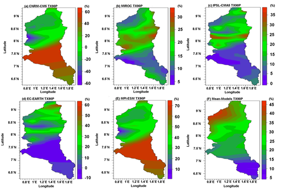 The changes relating to the 10th percentile of daily maximum temperature are shown in this Table. The lowest decrease is −12% and is projected in the North of Mono Basin by the model IPSL-CMA5 while the highest increase is 50% and is projected in the center by model MIROC. We note that, the projection models used showed a change of the 10th percentile of daily maximum temperature on the northern part of the basin of 5%, 30%, 20%, 15% and 18%, respectively for models CNRM-CM5, MIROC5, EC-EARTH, IPSL-CMA5, MPI-ESM and Mean-models. The southward and center, there is an increasing average in general for the 10th percentile of daily maximum temperature from 5% to 45%, and from 15% to 50%, respectively. Models used have announced clearly an increase over Mono Basin of the 10th percentile of daily maximum temperature.