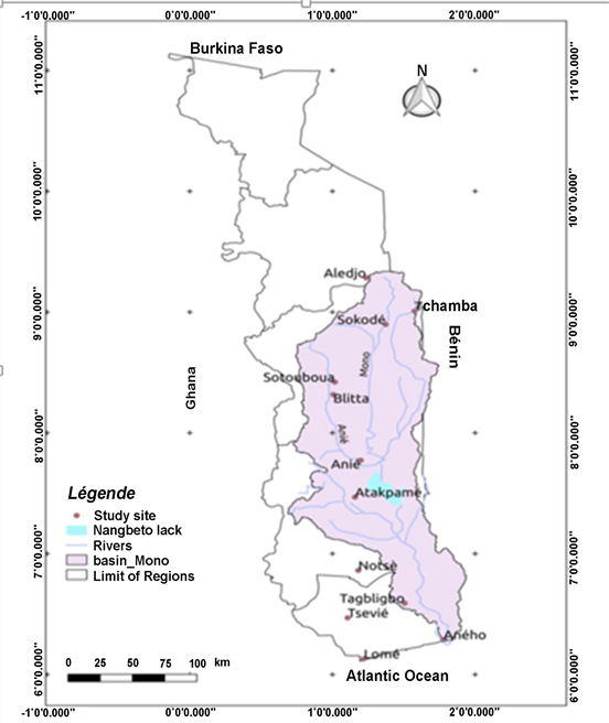 Located on the coast of the Gulf of Guinea in West Africa, Togo has a surface area of 56,600 km2, bordering the Atlantic Ocean in the south, Burkina Faso in the north, Benin in the east, and Ghana in the west. The Togolese population was estimated at 6.3 million inhabitants in 2007 according to the report of UNDP in 2007. The main important rivers are Oti, Mono, Kara, Keran, Koumongou, Anie, Zio and Haho. Mono Basin, which is the study area, is located in the Gulf of Guinea region, more precisely between 06˚16'N and 09˚20'N and 0˚42'E and 20˚25'E (Figure 1). The Mono River Basin is almost entirely in Togo although its lower course is between Togo and Benin. Our study considered the part in Togo. It houses a dam of hydroelectric power plant called Nangbeto. Draining a surface of 25,400 km2, the Mono River is the major one of Togo. The climate of the Mono River Basin is the one of West Africa which is controlled by the interaction of two air masses; the influence of which varies throughout the year with the north-south movement of the Intertropical Convergence Zone (ITCZ). Hot and dry continental air masses originating from the high pressure system above the Sahara desert give rise to dusty Harmattan winds over most of West Africa from November to February. In summer, moist equatorial air masses originating over the Atlantic Ocean bring annual monsoon rains [12] [13] [14] [15] . Within this West African context, Mono Basin’s climate varies from tropical to savanna. The southern part of the country is humid, with temperatures ranging from 23˚C to 32˚C. In the north, temperature fluctuations are greater from 18˚C to more than 38˚C. Rainfall in the south of the country comes in the form of two seasons (the first between April and July and the second between September and November). The dry desert winds of the Hamattan blow south between November and March, bringing cooler, drier weather, and periodic droughts to the north of the basin. According to the report of WAEMU in 2006, the population of the basin is approximately two million, with an annual increase of 2.9%. This population also distributed at high densities in the south