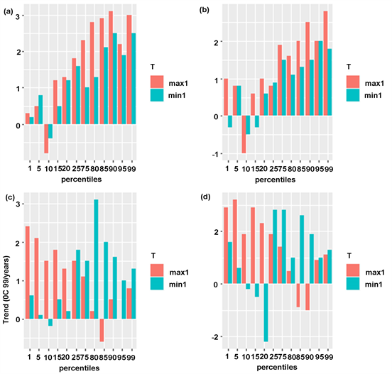 mentioned earlier, because of previously outlined regional differences between Northtern and Southern Basin, average trends from 2051 to 2100 are separated into southern and Northern areas. The plots in Figure 2 reveal considerable information regarding future trends and changes to the distribution of daily temperature. Over the North, higher percentiles of minimum and maximum temperature will increase at a greater rate than the lower percentiles during dry and rainy seasons (with differences more pronounced for maximum values). This is associated with significant increase in maximum and minimum temperatures over most parts of the Mono Basin. Unlike the North, lower percentiles will increase at a greater rate than the higher percentiles over south basin for minimum temperature. In fact, the lower percentiles of daily maximum temperature during all seasons show relatively increase while the higher percentiles of daily minimum temperature will increase at a greater rate than the lower percentiles during dry and rainy seasons in this area.