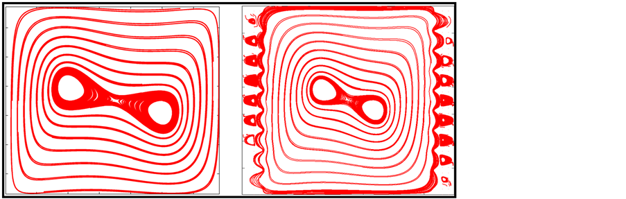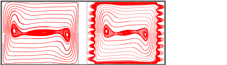 Figure 4 shows that as Ra number was increased, the average value of Nu decreased. This decrease in Nu was observed to be more at higher Ra number as compared to lower. The maximum decrease in the average heat transfer was calculated to be equal to 23.33% at Ra number equal to 106. The decrease in the average heat transfer may be due to following: a reduction in the volume of fluid in the presence of roughness, a decrease in the effective distance between isothermal walls, and formation of eddies or vortices in the wakes of the roughness elements in the presence of roughness. When the sinusoidal roughness elements were introduced in the cavity, the effective distance between isotherms was decreased, this resulted in the decrease of average or effective Ra number. This decrease in Ra number may cause a decrease in the average heat transfer. Also, due to the presence of the roughness in the cavity of same dimensions as in case of smooth, volume of fluid was reduced. Heat transfer takes place from hot to cold wall through a medium, this decrease in the average volume of the fluid may cause a reduction in the average heat transfer in the cavity. Similar results were reported by Amin [10] [29].