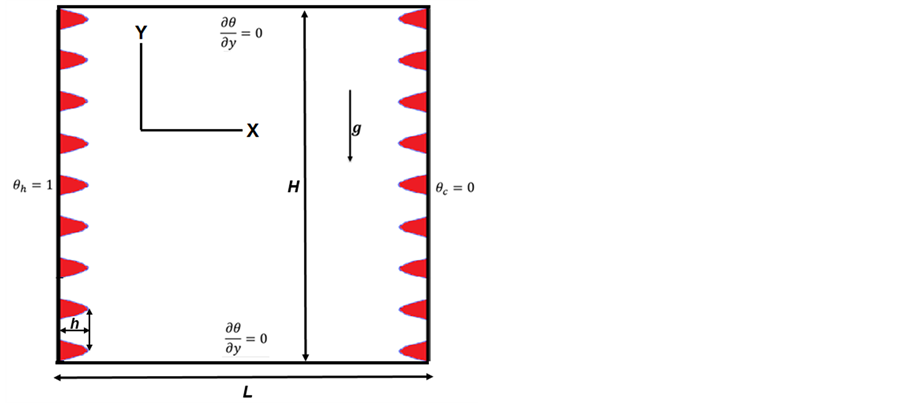 ing walls. During this numerical experiment, the sinusoidal roughness elements were at the same boundary condition as corresponding vertical or isothermal walls of the cavity. Coupled momentum and energy equations were solved in a laminar flow region with assumption that viscous dissipation was negligible and fluid was assumed to be radiatively non-participating medium [10]. The coupling between Navier-Stokes and energy equation was made by using the Boussinesq approximations. All other physical properties were considered constant except the density, which was varying with temperature as shown in Equation (1) [16].