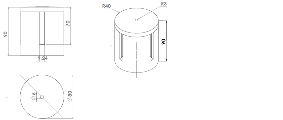 Atmospheric icing research team at Narvik University College is developing an atmospheric icing sensor which is potentially capable to detect icing event, icing type, icing load, icing rate, melting rate. The final material of this icing sensor is aluminium, nevertheless to evaluate the option of using ABS (Acrylonitrile butadiene styrene) as one of the potential material, the thermal conductivity of ABS was important to estimate in freezing domain. The geometry of this model was a scaled down model of the rotating part of the actual sensor which was produced through rapid prototyping machine CubePro Duo (Figure 1). The CAD Model was developed using Solid Works and the dimensions are given in Figure 2.