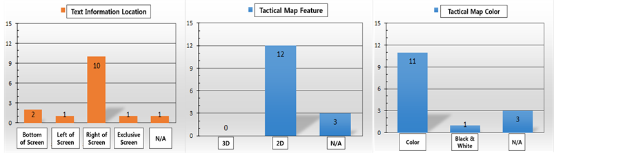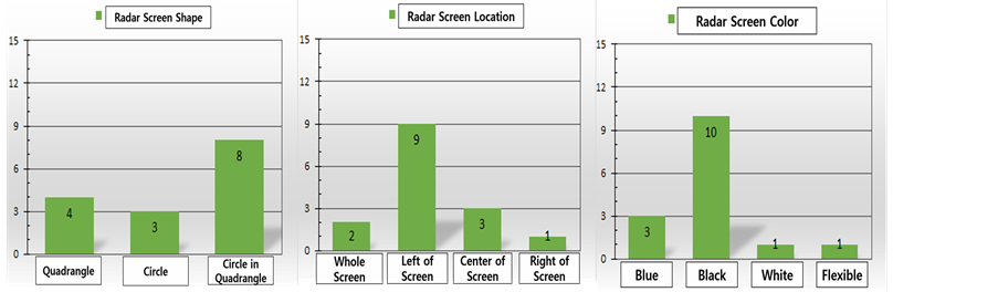Radar screen which form is circular shape onto a quadrangle screen taking the largest proportion. Position of radar screen mostly is displayed on the left side of its screen. Its background’s color is usually dark color such as black, blue, indigo. Text information of radar screen is normally on its right side. Recent radar screen system has evolved into free-form with adapting its components to user’s convenience. Recent trend of radar screen is including Tactical map into its components. Previous trend is using 2D color Tactical map. In the future warfare, radar screen will need 2.5D, 3D Tactical map. Most of radar screens have 4 monitor up down left right side. The number of user will be 2 or 3, and their assignments are detecting radar screen, management of arm and total control. Table 8 shows results.