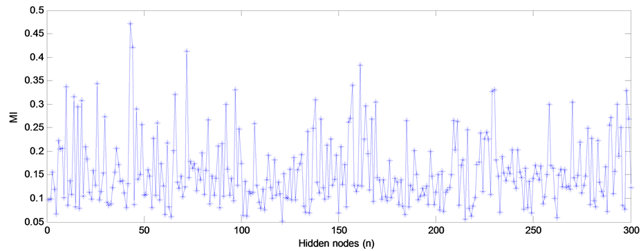 Figure 2 shows that the maximum MI value is almost 10 times than that of the minimum value. Thus, the hidden layer’s outputs are not stability. It is needed to select outputs with high MI values.