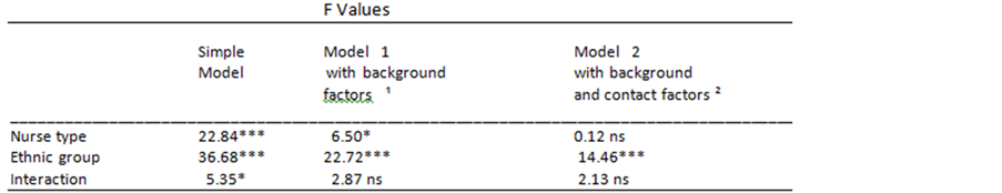 A Two-way analysis of covariance was used to examine differences in scores between nurse types and ethnic groups while accounting for the contribution of background, and contact factors, respectively. As shown in Model 1 (Table 6) when background demographics and work experience were entered as covariates, the main effects were statistically significant according to nurse type (F(1,188) = 6.50, p < 0.05) and ethnicity (F(1,188) = 22.72, p < 0.001). Inspection of the means indicated that Chinese nurses (mean = 2.37, s.d. = 0.79) reported higher stigma than Anglo nurses (mean = 1.80, s.d. = 0.64). Chinese general nurses (mean = 2.74, s.d. = 0.76) reported higher stigma than Chinese psychiatric nurses (mean = 2.11, s.d. = 0.72).Anglo general nurses (mean = 1.95, s.d. = 0.66) also reported higher stigma than Anglo psychiatric nurses (mean = 1.72, s.d. = 0.61). The interaction term was not significant (F(1,188) = 2.87, p > 0.05).Compared with the Simple Model (where background factors were not in the model) the effect of nurse type was much reduced but not eliminated by the inclusion of background covariates. Similarly, the effect of ethnicity was reduced but not eliminated by the inclusion of these background factors. Each individual covariate such as age (F(1,188) = 1.36, p > 0.05), and (sex, years in mental nursing, and years in general nursing (F(1, 188) =< 1)) had no simple effect.