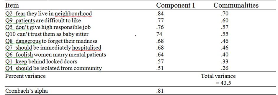 A PCA analysis was conducted on the social distancing and alienation items. Table 2 shows the component matrix as only one factor was extracted according to the Kaiser criterion. This one dimension accounted for 43.5% of the variance in the items by dropping one item with low loading (that is, “mentally ill people are no more dangerous than others”). All the other nine items accounted for the high reliability (0.81, Table 2) relating to opinions expressed towards psychiatric patients, such as “fear of mental patients living in neighbourhood”, “cannot trust psychiatric patients as baby sitters”, and “foolish for women to marry mental patients”. This measure, as intended, captures the construct of social distancing and alienation of those with a mental illness.