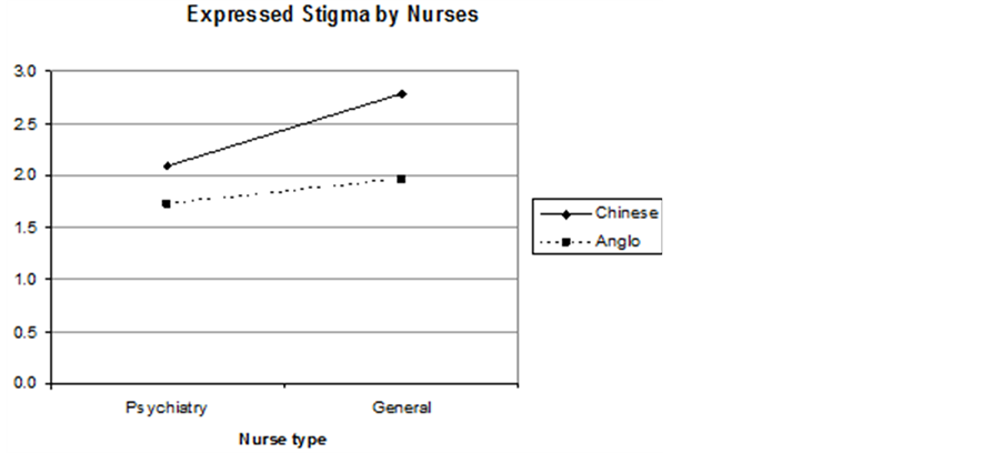 Two-way analysis of variance examined differences in scores between nurse groups and ethnic groups as before. The main effect of nurse type was significant (F(1, 203) = 22.84, p < 0.001) as was the main effect of ethnicity (F(1,203) = 36.68, p < 0.001). Examination of the means indicated that Chinese nurses (mean = 2.38, s.d. = 0.81) reported higher stigma than Anglo nurses (mean = 1.81, s.d. = 0.64) and general nurses (mean = 2.34, s.d. = 0.83) higher than psychiatric nurses (mean = 1.87, s.d. = 0.67).Additionally, the interaction effect was also significant (F(1,203) = 5.35, p < 0.05) indicating that stigma differed across ethnic groups and nurse types. Chinese general nurses (mean = 2.80, s.d. = 0.78) scored highest on this scale than the other three groups of nurses: Chinese psychiatric nurses (mean = 2.08, s.d. = 0.71), Anglo general nurses (mean = 1.96, s.d. = 0.66), and Anglo psychiatric nurses (mean = 1.73, s.d. = 0.61), as evident in Figure 1.