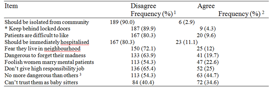 labelled as Stigma towards Psychiatric Patients (STPP). For the present study, items included “mental patients should be kept behind locked doors” and “a foolish woman would marry a man with mental illness”, among others. Responses were on a 5-pointscale: “1” for “disagree”, “2” for “tend to disagree”, “3” for “ neither”, “4” for “tend to agree” and “5” for “agree”.