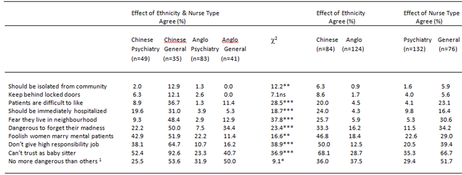 With regards to whether or not the nurses had received psychiatric training, the results indicated that a large number (over 90%) of psychiatric nurses in the sample had psychiatric training. As indicated in Table 1, a smaller number of general nurses than psychiatric nurses, and a smaller number of Chinese General nurses than Anglo nurses, had psychiatric training. This difference was statistically significant. Though the majority of nurses underwent nursing training through a course of study ranging between 80% and 100%, there were no significant differences in relation to training course, in-service training or other forms of experience when the sources of training were compared.