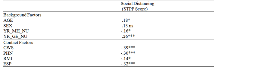 Correlations between Social Distancing and other measures (background demographics) are summarized in Table 5. These are direct correlations without taking account possible confounding between variables. Social distance and alienation of the mentally ill (STPP) is positively correlated with, particularly, age, years in general and mental health nursing.