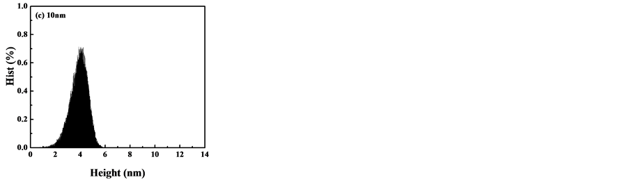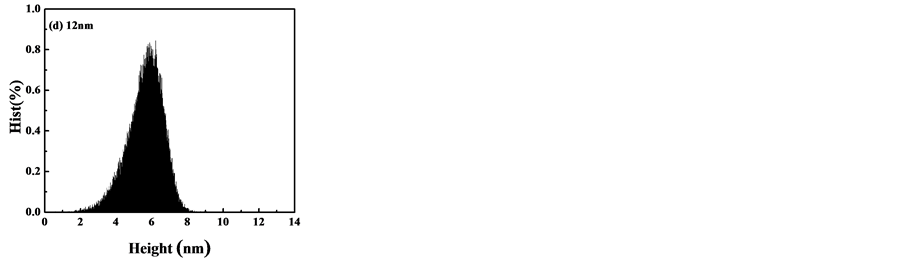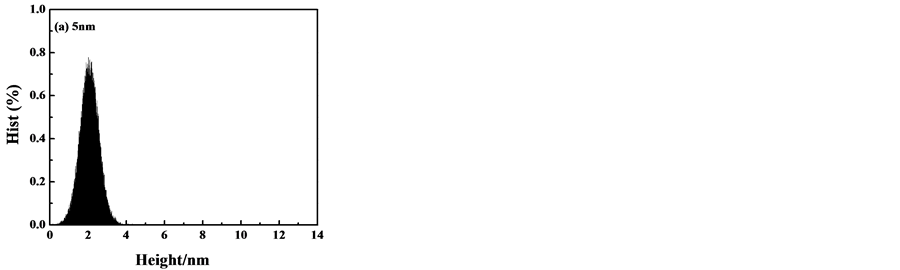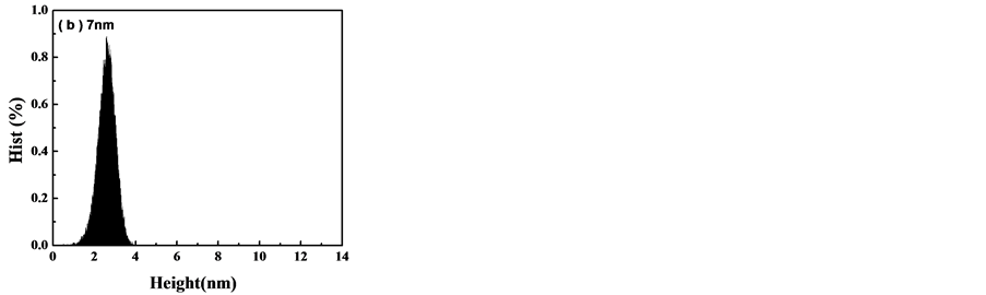 In order to statistically explore the Ag NPs height and distribution, we made histogram of the 2D surface-height values from the respective to pographies. As shown in Figure 4, the abscissa represents Ag NPs heights, and ordinate represents a percentage. Here, we can seeAg NPs height value is smaller than 4 nm when the thickness is 5 nm and 7 nm, but that of thickness with 7 nm is more concentrated. However, this is not