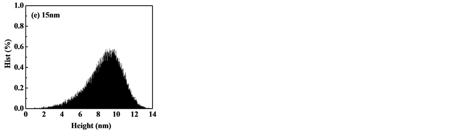 Figure 4. Histogram of the 2D surface-height values from the respective topography. (a) 5 nm, (b) 7 nm, (c) 10 nm, (d) 12 nm and (e) 15 nm.
