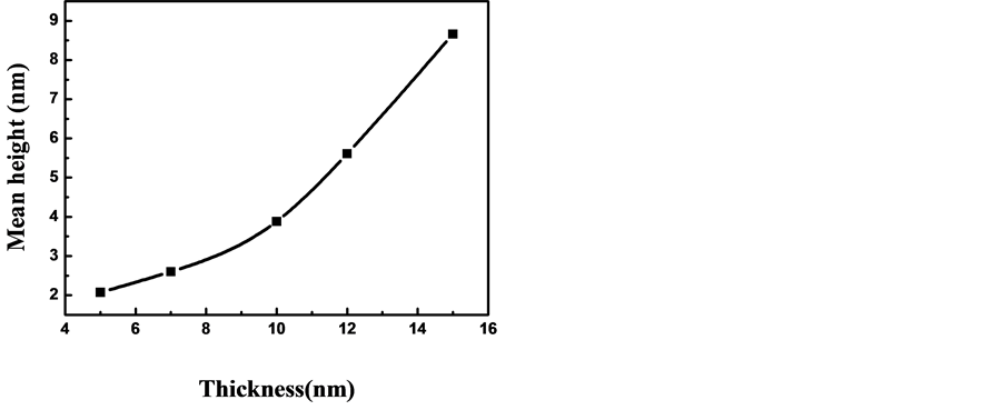 Besides, to observe the increasingrate of mean height of AgNPs, we drew a curve about thickness and particle mean height value, as shown in Figure 5. Here we focus on the increasing rateof mean height value (the slope of curve). In the initial deposition stage, the increasing rate of mean height value is slow when thickness increases from 5 nm to 7 nm, but it begins to increase quickly as the thickness thicker. Figure 5 actually reflects the change of growth rate of Ag particles in vertical direction on the substrate surface as the thickness thicker. The slope of the curve indicates that the growth rate of Ag particles in vertical direction is small when thicknesses