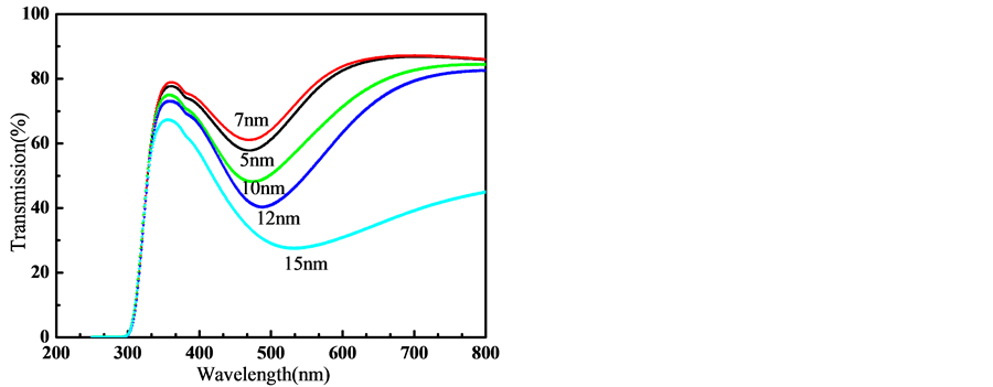 Figure 6. The transmittance spectra of Ag NPs thin films with different thickness.