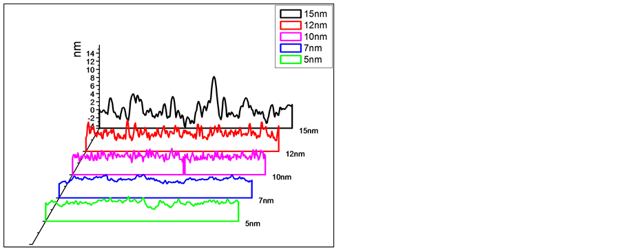 In Figure 2, we can see that surface fluctuation is relatively flat when the thicknesses are 5 and 7 nm. While, the surface fluctuation becomes severely when the thickness increases from 10 nm to 15 nm. So peak-to-valley values are 4.573 nm (5 nmAg), 4.681 nm (7n mAg), 6.133 nm (10 nmAg), 9.764 nm (12 nmAg), and 14.177 nm (15 nmAg), respectively. We can also see that from the picture the width of the peaks or valleys increases gradually from 16nm (10 nmAg) to 41 nm (15 nmAg), which is used to estimate the average particle size.