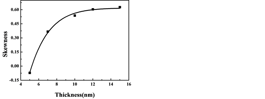 increase from 5 nm to 7 nm, but it gradually increases as thickness thicker. Taking the analysis about skewness into account, we can make a conclusion that the growth rate of Ag particles in lateral and vertical vary with films thickness. In the initial stage, the growth rate of Ag particles in lateral direction is dominant when thickness increases from 5 nm to 7 nm and then the growth rate of Ag particles in vertical direction is dominant when thickness increases from 12 nm to 15 nm.