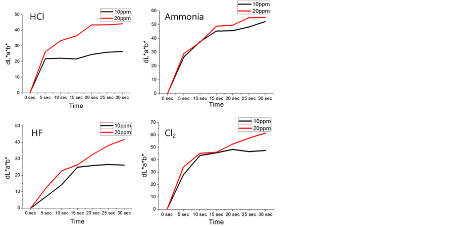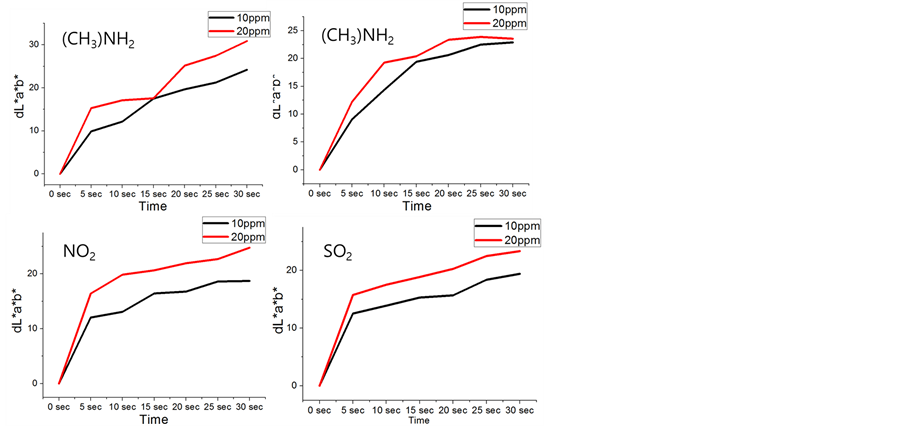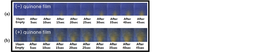 But, for the (+) benzoquinone, color changes owing to same condition was observed after 10 seconds from initial state (Figure 6(b). By the addition of benzoquinone which accelerates the electron transfer between dye and toxic gas on the basis of oxidation-reduction reaction, [4]-[6] the fast color changing was observed.