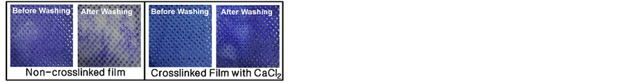 From the results of non-crosslinked film in Figure 7, most parts of coating layer consisting sodium alginate and dye was disappeared after washing. In case of crosslinked film with calcium chloride, the opposite was observed. This means that crosslinking effect of sodium alginate with CaCl2 was effective for the enhancement of water resistance of prepared film type colorimetric sensor. Considering of the pre-mentioned results, colorimetric sensors containing various dyes manufactured through in situ coating and crosslinking process using sodium alginate solution are very useful tool for the detection of toxic gases in working place with naked eye.