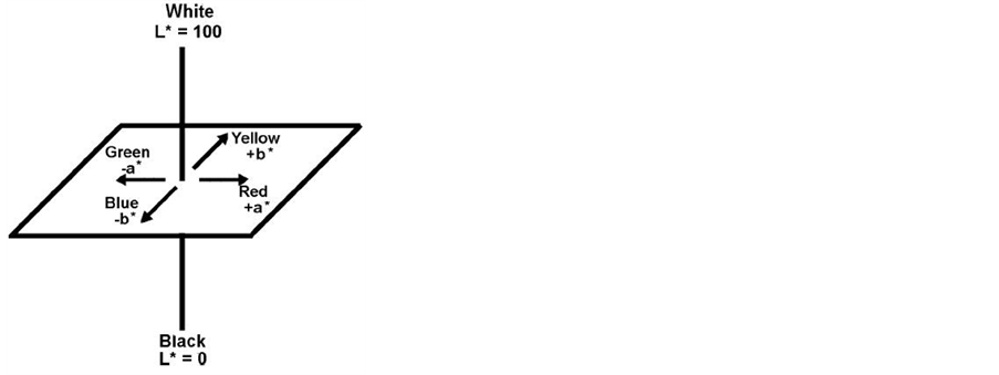 The International Commission on Illumination (CIE) first recommended the CIELAB color scale as a standard approximately, uniform color scale in 1976 [7], whereby colors are plotted in a cubic color space, as shown in Figure 8. The 4 dyes contained in the colorimetric film sensor is initially blue (or yellow) in color, and is converted to yellow(or blue) upon gas-contacting. The key parameters in color change are in a*, b* and L*, and ?Δ(a, b and L)* is defined: −Δa(or b, L)* = a(or b, L)*dark − a(or b, L)*sample, t where the ‘dark’ sample was the initial state of film sensor, but before subsequent gas contacting and “sample,t” refers to the film some time, t, after gas contact [8] [9]. The total color changing results (ΔE*) were expressed as following equation and summarized in Table 1 and Figure 9.