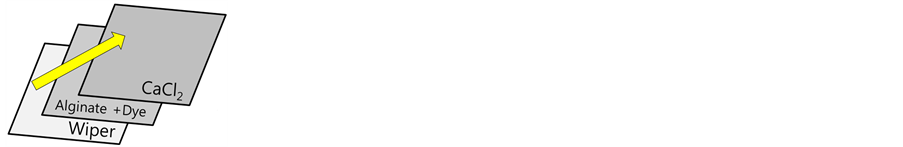 The pH indicating and water soluble dyes p indicatingdyes were mixed with hydrophilic binder(Sodium Alginate, SA) to 0.1 wt% of dye in 1 w% of SA aqueous solution with or without benzoquinone (0.5 wt%), then this solution was coated on the nonwoven fabric sheet and cured with calcium chloride solution (10 wt%) (Figure 3). After curing, coating layer on nonwoven sheet showed improvement of water repellency.