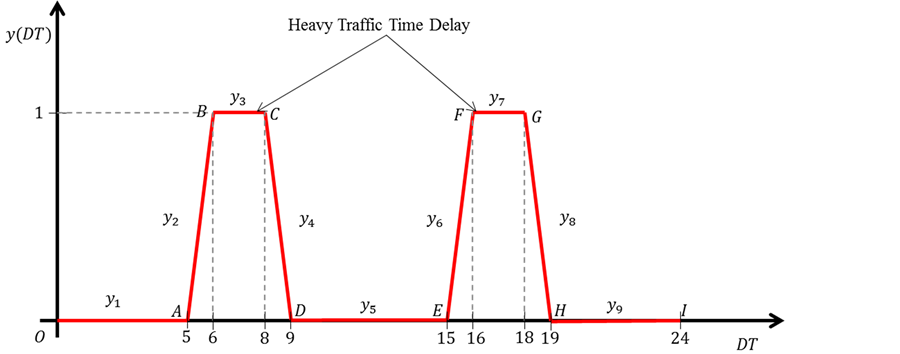 ) of such points O, A, B, C, D, E, F, G, H, and I are defined as the input parameter (provided by the software user). Thus, this piece-wise linear time function can be (conveniently, and appropriately) provided to take into account of different local traffic congested time. In general, one may have different function