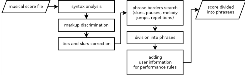 ・ The score analysis module responsible for carrying out a preliminary analysis. The music score is read in from a file first. The melody is then divided into fragments (musical phrases). A performance rule pattern search is performed last (e.g. phrase arches, up/down progressions, climaxes etc.).