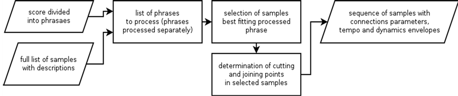 The input is made up of the output of the score analysis module described in Section 3.1. A text file containing a list of the sound samples used, their sequence (the indices of the respective samples, a number associated with the starting and ending note used within a sample, and whether it is connected with the next sample) as well as rhythmic, agogic (the main tempo and the tempo envelope), and dynamic (the amplitude envelope) data serves as the output.