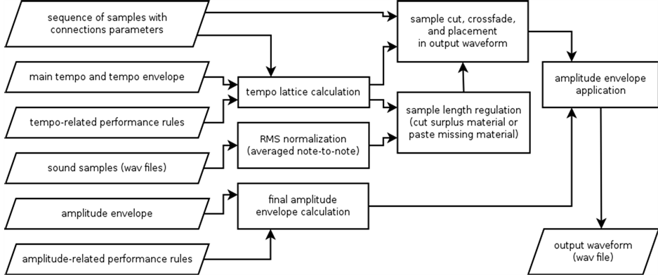 A detailed account of the concept of the system was originally presented at the 2014 Forum Acusticum [3]. Implementation details with regards to score analysis and sample joining were presented at the OSA2015 conference [4] whereas the performances rules following those in [5] [6] were discussed at ISSET2015 [7]. This article presents the whole synthesis system, reflecting the feasibility of the ideas presented previously with the following self-imposed limitations: