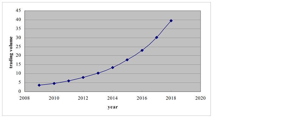 From 2009 to 2018 the simulation data of the trading volume over time trend graph can be seen that the number of the China’s electronic commerce market transactions has gradually from slowly increase to a rapid growth trend.