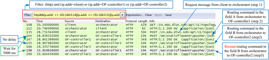 If the client chooses the reliable service communication, the experimental results are shown in Figure 6. The orchestrator is chosen as the observation point. The differences from the unreliable service communication are that the orchestrator concurrently sends the routing commands to two OpenFlow controllers. Moreover, after