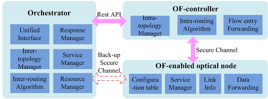 The function block diagram of the SDSON based on cloud platform is shown in Figure 2. The orchestrator, as the centralized controller of different domains, can response to the requests from the application layer or clients in time. Moreover, it can receive the intra-topology information from OpenFlow-controllers, and then analyze and store the global topology information. When the network fails to transmit certain messages, the orchestrator can analyze the service transmission information to find out the failed messages and resend the commands to OpenFlow-controllers. Moreover, the orchestrator is supposed to provide a unified interface and inter-domain routing algorithm. The OpenFlow-controllers collect the node link information from the data plane nodes and store the inter-domain topology information, which is sent to the orchestrator. According to the commands from the orchestrator, the OpenFlow-controller passes the flow entries to the data plane nodes. Generally, the OpenFlow-controller is responsible for the centralized control of the intra-domain nodes and the unified management of the intra-domain network resource. The data plane nodes are utilized to configure the optical switch matrixes states on the basis of the flow entries, analyze and store the transmitted and received messages, and discover the link information and implement the packet forwarding and etc. The orchestrator communicates with OpenFlow-controllers through Rest API based on HTTP protocol, while the OpenFlow-controllers communicate with the data plane nodes through secure channels based on the OpenFlow protocol.
