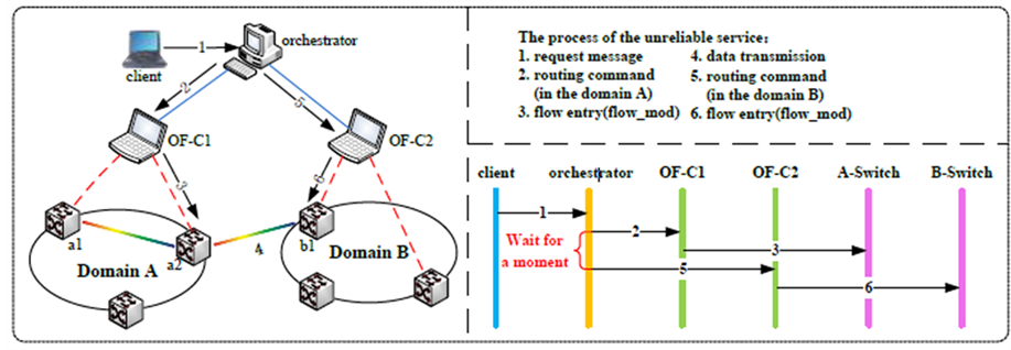 If the client chooses the unreliable service communication, the experimental results are shown in Figure 5. In the experiment, the orchestrator and OF-C1 are chosen as the observation points. The signaling process on the orchestrator is shown in Figure 5(a). The client acquires the information or sends the requests to the orchestrator through the GET or POST method in HTTP protocol. Once receiving the requests, the orchestrator delivers the routing commands to the OpenFlow-controllers. The time of the commands transmitted to two OpenFlow- controllers is about 2000 ms. Figure 5(b) illustrates the signaling process on the OF-C1. After obtaining the routing commands from the orchestrator, the OpenFlow-controllers forward the flow entries named flow-mod to the OpenFlow-enabled optical nodes.