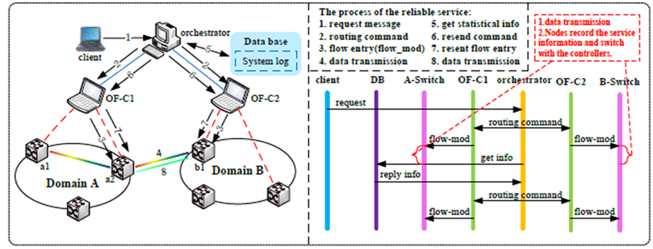 The function verification of the reliable service and unreliable service communication models is performed on the experimental platform. The orchestrator and two different OpenFlow-controllers such as Floodlight and OpenDaylight run on the OpenStack. The two OpenFlow-controllers connect with OpenFlow-enabled optical nodes and control two different domains respectively. The translation layer software in the OpenFlow-enabled optical nodes translates the flow entries stored in the Open vSwitch software to the commands which can be recognized by the optical devices. Afterwards, the commands are delivered to the FPGA, which controls the optical devices.