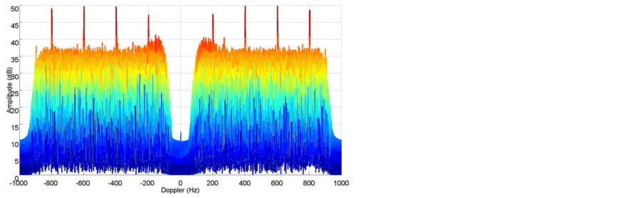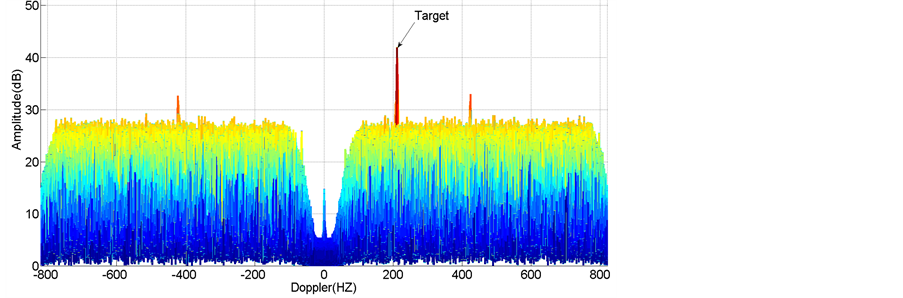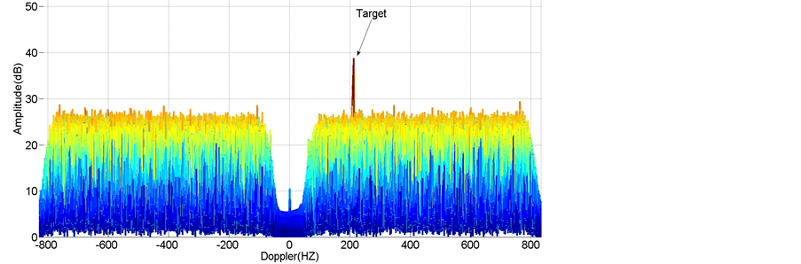 In order to improve the weak signal receiving ability, the gain of the receiver should be set as the maximum, and the synthesis of an adapted pattern with a null in the direction of the reference illuminator. What’s more, the fast block least mean square filter is used for further reduction of the direct path interference. This method has advantages of fast computation speed and fast convergence. The data of 0.4 s length is selected, and the adaptive filter iterative parameter is set as 0.006 and the filter length 512. The filter results of a test data is shown in Figure 6(a) and the cancelling gain achieves 24.4 dB.