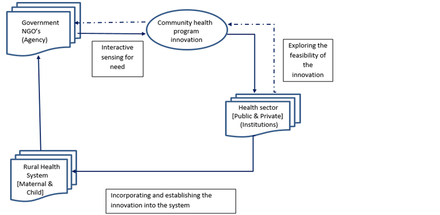 In the above discussed social innovations that greatly impacted the healthcare sector in Bangladesh, the NGOs, together with the government, served as the agent to sense the need and interact with the rural health system to monitor the social responses. Using the framework developed in [2], we try to explain the process of how these social innovations happened. As depicted in Figure 1, the agent, dominated by the NGOs in collaboration with government, communicates with the institution that includes the public and private healthcare providers as well as the rural families, regarding the new ideas or practices to explore the feasibility of them. In the innovation process, as the institutions are an integral part of the whole social system, through legitimate action, the information of the new ideas and practices is passed to the system. As more units in the institution adopt the new ideas or practices, the new practices or ideas in the implemented format become part of the collective norms, habits and the overall culture of the society. As a result, the implemented ideas or the practices become a successful social innovation.