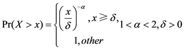 M/Pareto [14] burst traffic is regarded as a superposition of many ON/OFF sources with heavy tailed ON or OFF durations. These bursts arrives by the Poisson process with the arriving rate λ, and the duration of each burst is a random variable X, which follows Pareto distribution with the shape parameter α and position parameter δ (δ for burst shortest duration). Thus, the complementary distribution function can be expressed as