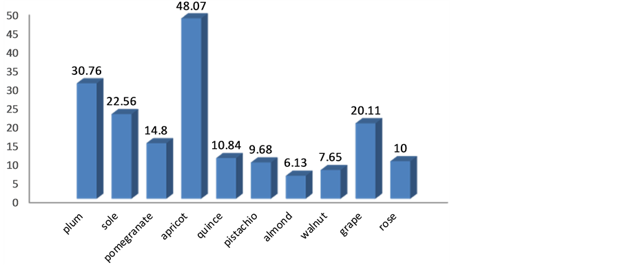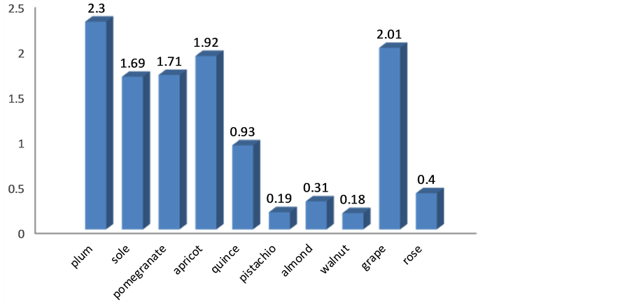 plum with 2.3 and walnut with 0.18 kg respectively. Also apricot has the highest gross income per 1 m3 irrigation water with 2880 Tomans and almond has the least with 372 Tomans.