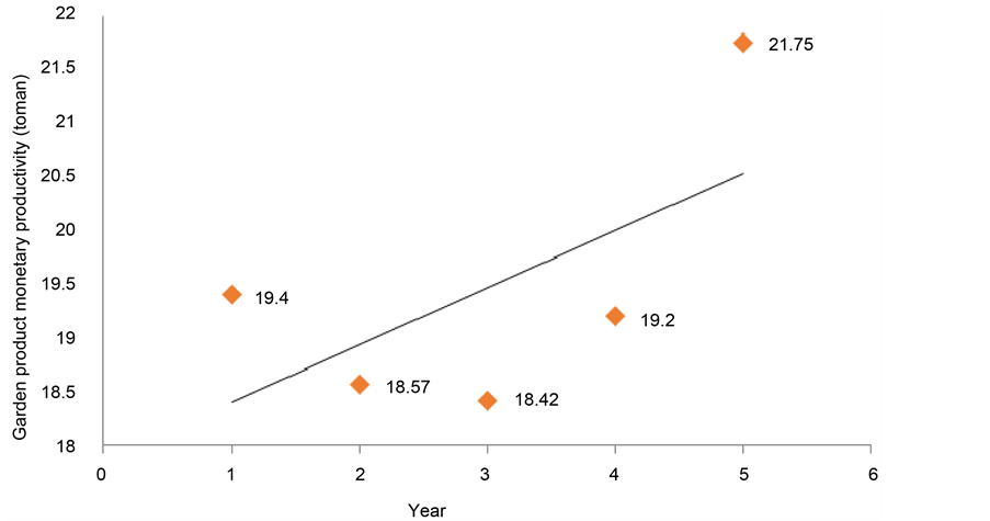 Figure 7 shows at first monetary productivity of garden products has decreased and then increased during the study period. One of the basic reasons of this decrease is extreme cold and frost in the region which destroys many fruit trees in January of 2007. After 2 years downward trend, it increased in 2009 and 2010.
