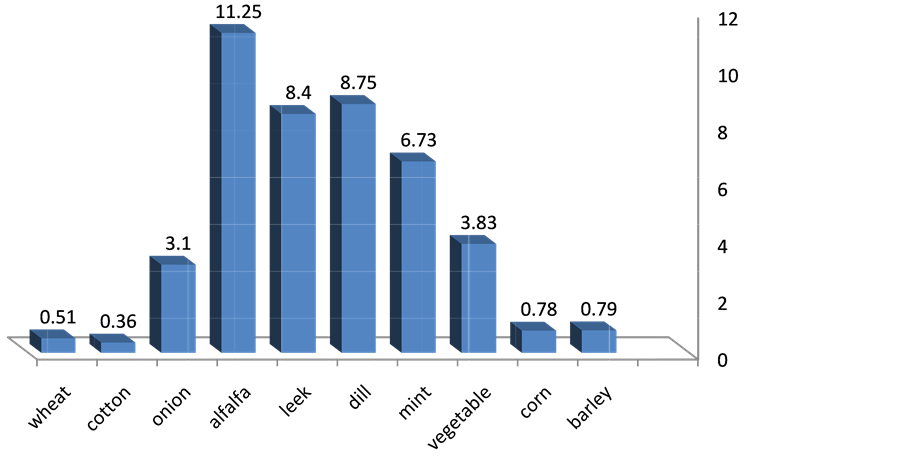Figure 1 shows that alfalfa has the maximum and cotton has the minimum physical productivity (the ratio of production quantity to quantity of water use) among the crops. Due to the specific shape of root and several harvests in a crop year, alfalfa has very high productivity.