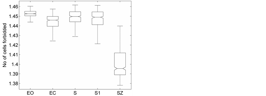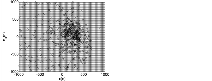 Next, we identify and count only those cells in the matrix which do not contain any points. These empty cells correspond to forbidden cells which are not visited by the HTSP of a particular time series and their total count yields what we call forbidden count (FC). In other words, the remaining count (total count-forbidden count) yields the number of cells in the matrix which do contain one or more points. These cells in the matrix correspond to filled cells which are visited by the HTSP of a particular time series and their total count yields a measure proportional to dispersion/variability, which we call it as dispersion complexity (DispComp). It is interesting to note that if a time series is random then, it is likely that most of the cells in the matrix are visited/covered one time or other. In this case, the dispersion complexity of the signal is higher and the FC is smaller. Thus, Disp-