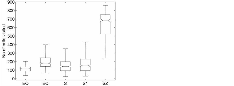 Representative HTSPs for the different EEG states, one from each of the five sets, are shown in Figure 1 and Figure 2. Figure 1(a) and Figure 1(b) show, respectively, HTSPs for EO and EC EEG signals from normal subjects (sets A and B). The plots clearly show differences between the two states. The points corresponding to EO state tend to be located close around the origin, while those corresponding to EC state are comparatively spread in the diagram. This implies that the EEG variability in brain activity is increased when the eyes are closed compared to that when eyes are open in the same subject. This can be attributed to changes in frequency content and degrees of freedom in the corresponding EEG signals as the mental state is switched from one to another. Figures 2(a)-(c) show, respectively, HTSPs for inter-ictal states (from hippocampal formation of the opposite hemisphere of the brain), inter-ictal states (within epileptogenic zone), and ictal states (sites exhibiting seizure activity) of epileptic subjects (sets C, D, and E). The plots clearly show differences between the two states, non-seizure and seizure. The points corresponding to inter-ictal state, in Figure 2(a) and Figure 2(b), tend to be located close around the origin, while those corresponding to ictal state, in Figure 2(c), are widely spread in the diagram. This implies that the EEG variability in brain activity is increased drastically when in the ictal state compared to that when in the inter-ictal state. This can be attributed to changes in frequency content and degrees of freedom in the corresponding EEG signals as the mental state is switched from chaos to order. Comparing HTSPs in Figure 1(a), Figure 1(b), Figures 2(a)-(c) the following conclusions can be drawn: 1) Least degree of variability is found in the inter-ictal states, while highest degree of variability can be found in ictal states. 2) The degree of variability in normal EEG states is higher than that of inter-ictal states, while considerably lower than that of ictal state. Now we quantify these conclusions for the entire Bonn database using DispEntropy, DispComp, and FC. Figures 3(a)-(c) depict respectively, the distribution of DispEntropy, DispComp, and FC values for the five individual EEG states belonging to the different sets in the Bonn database through the box and whisker plots. The results of statistical analysis of independent-samples t-tests for each pair of non-seizure and seizure classes are shown in the second column of Tables 1-3. Since very significant statistical differences between classes were found (p < 0.0001), the ROC analyses were performed to assess the diagnostic ability of this nonlinear method. The descriptive results for AUC, average sensitivity, average specificity, average precision, and average accuracy are summarized in the columns three through seven of the same Tables 1-3. From the tables it is very clear that all three measures, DispEntropy, DispComp, and FC, can readily discriminate between seizure and non-seizure states with very high accuracy.