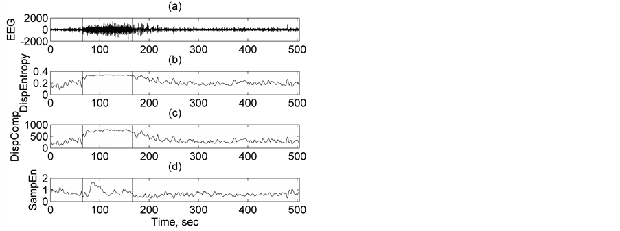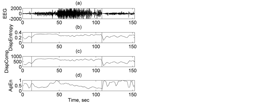 ning and at the end. The seizure becomes more regular and coherent in the middle part. Let us examine the variation of Disp Entropy and Disp Comp with time as seizure progresses. At the onset of seizure, as seen from Figure 4(b) and Figure 4(c), DispEntropy and DispComp increase gradually to higher values and remain almost constant during mid-seizure. After the seizure offset, both decrease gradually to the lower inter-ictal background