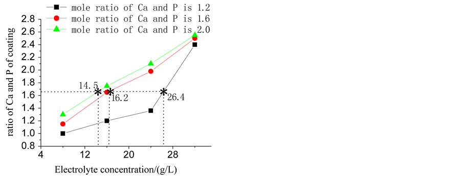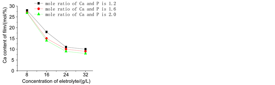 This conclusion can guide the configuration of electrolyte in the process of micro arc oxidation, and then determine reasonably proportioning of the calcium and phosphorus compound reagent.