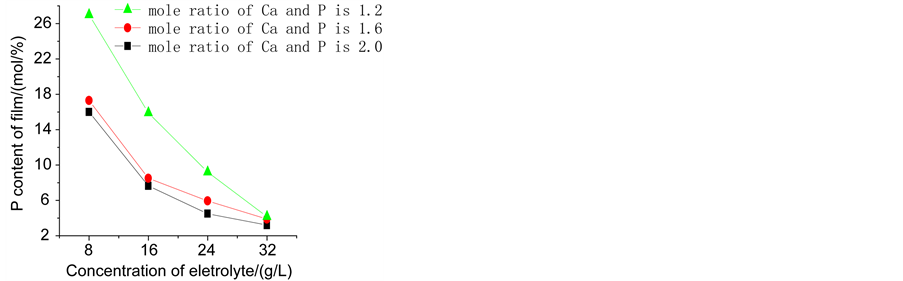 directly affects the gas discharge breakdown state, and indirectly affects the calcium and phosphate ions number into the layer and combined to form calcium phosphate salt opportunity, which leads calcium and phosphorus content in the coating is decreased. But when the electrolyte concentration is increased to a certain extent, and colloidal particles concentration is close to saturation, the voltage drop of electrolyte is tend to the steady state, so the calcium and phosphorus content in the coating is changed slowly. Because the phosphorus than calcium ion is more difficult to get into discharge channel [12] , at the same time with the same electrolyte concentration, Compared with the calcium ion concentration is increased, the phosphorus ion content is on the decline, so in the coating the phosphorus ion content is decreased significantly. So in the same concentration, in the electrolyte of lower Ca/P molar ratio the higher phosphorus content should be guaranteed, which will ensure that there are more P ions to get into the discharge channel, and there is more calcium and phosphorus is contained in the coating.