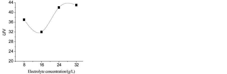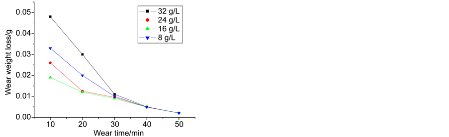 From the wear capacity in Figure 6 and wear time curve, it can be seen that for the electrolyte concentration of 16 g/L and 24 g/L, the former wear capacity (in 30 min) are also less than 8 g/L, but the concentration of electrolyte is 32 g/L, it is the larger amount of wear and tear at the same time. That is mainly due to the more thick