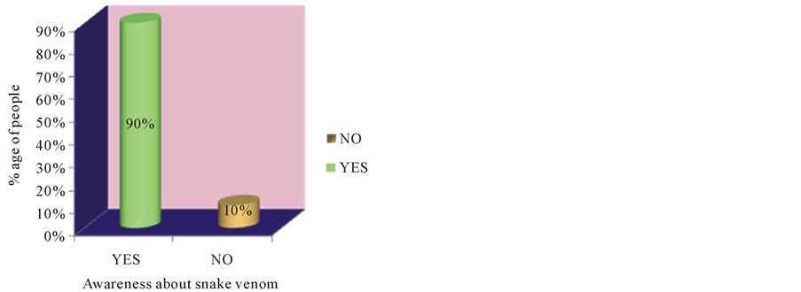 The result was expressed in percentages by using bar graphs and pie charts. Bar graphs were used to evaluate that how many people know about snake venom (Figure 1). Pie charts were used to analyze the number of people who were treated by snake venom derivatives (Figure 2) and to evaluate the spectrum of snake venom in different diseases (Figure 3).